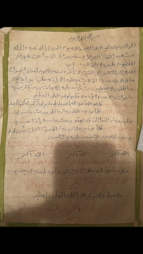 فيما تضمنت الورقة عدة سور وآيات، منها سورة الفاتحة وآية الكرسي، فضلاً عن مجموعة من الأدعية.