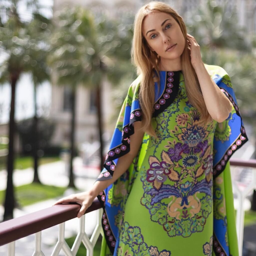 اختارت مريم أوزرلي فستان ماكسي من علامة لادوبليج La DoubleJ، وهو تصميم مصنوع في إيطاليا من قماش الحرير المطبوع بنقشات زهرية غنية بالألوان. يتميز الفستان بأكمام منسدلة بأسلوب الكاب، تضيف حركة وانسيابية لافتة.