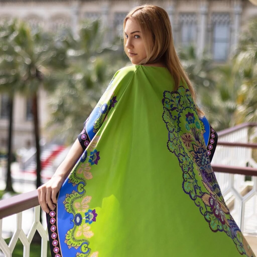 جاء الفستان باللون الأخضر الزاهي، مع تداخل ألوان نابضة بالحياة من الأزرق والبنفسجي والبرتقالي، حيث برزت نقشة الورود بشكل جذاب يعكس أجواء الربيع. كما حمل التصميم طابعًا شرقيًا واضحًا من خلال قصته، خاصة مع الكاب المنسدل من الخلف بنفس اللون والنقشة. وتُعد هذه القصة تحديدًا من التصاميم المفضلة لدى أوزرلي، التي تميل إلى الإطلالات المنسدلة والغنية بالتفاصيل.