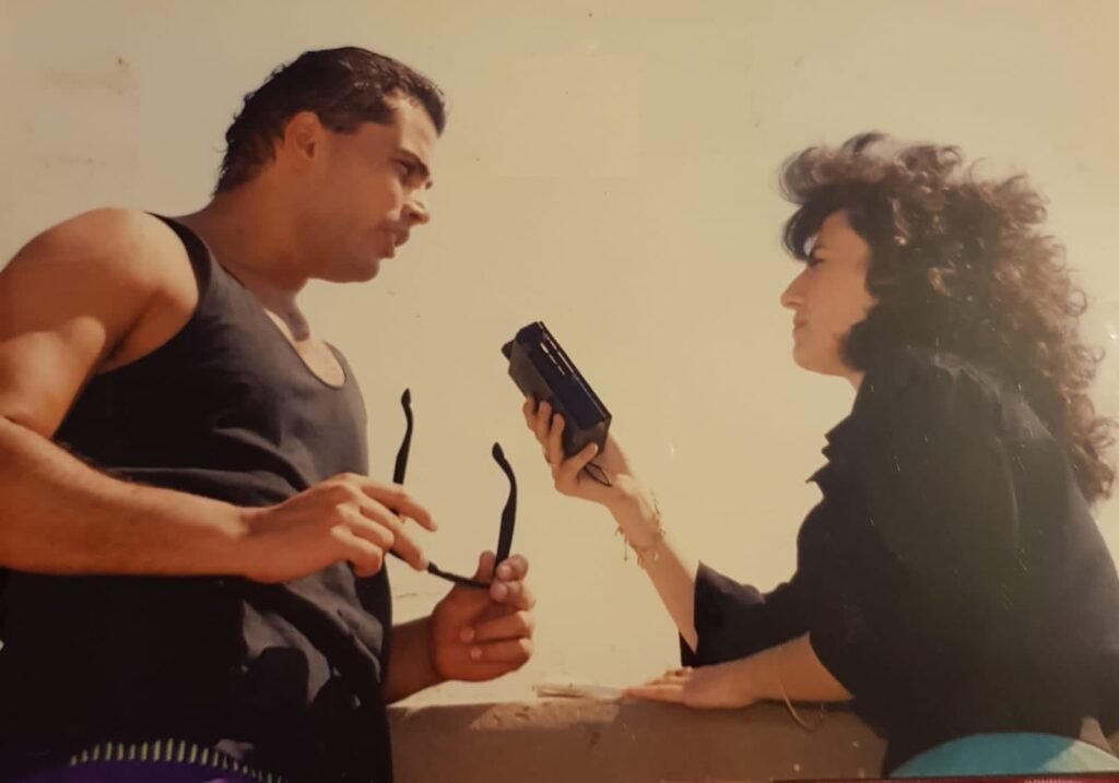 عام ١٩٩١ كانت زيارته الأولى وكان اللقاء الخاطف في صالون الشرف بمطار بيروت الدولي في مؤتمر مصغر مع زملاء أعزاء على هامشإحيائه حفلة غنائية في فندق “البريستول” حيث كانت لنا فرصة خاصة لتسجيل حوار قصير معه في اليوم التالي؛ تمت إذاعته في “راديوميوزك باور” مع أخي صاحب ومدير عام الإذاعة فؤاد كيالي وكنت أشغل وقتذاك منصب مديرة البرامج .