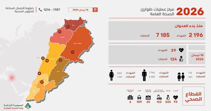 الصحة: ارتفاع الحصيلة الإجمالية للغارات الإسرائيلية منذ 2 آذار حتى 16 نيسان إلى 2196 ضحية و7185 جريحاً الصحة: ارتفاع الحصيلة الإجمالية للغارات الإسرائيلية منذ 2 آذار حتى 16 نيسان إلى 2196 ضحية و7185 جريحاً التقرير اليومي عن المؤلف فؤاد كيالي - كاتب ومخرج إذاعي Author عرض كل المقالات